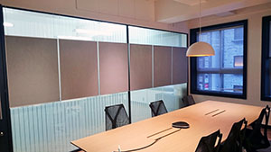 壁面、ガラスパーティション面にミュートパネル(吸音パネル)を設置(ガラスパーティション面はピクチャーレールに吊るしてあります)